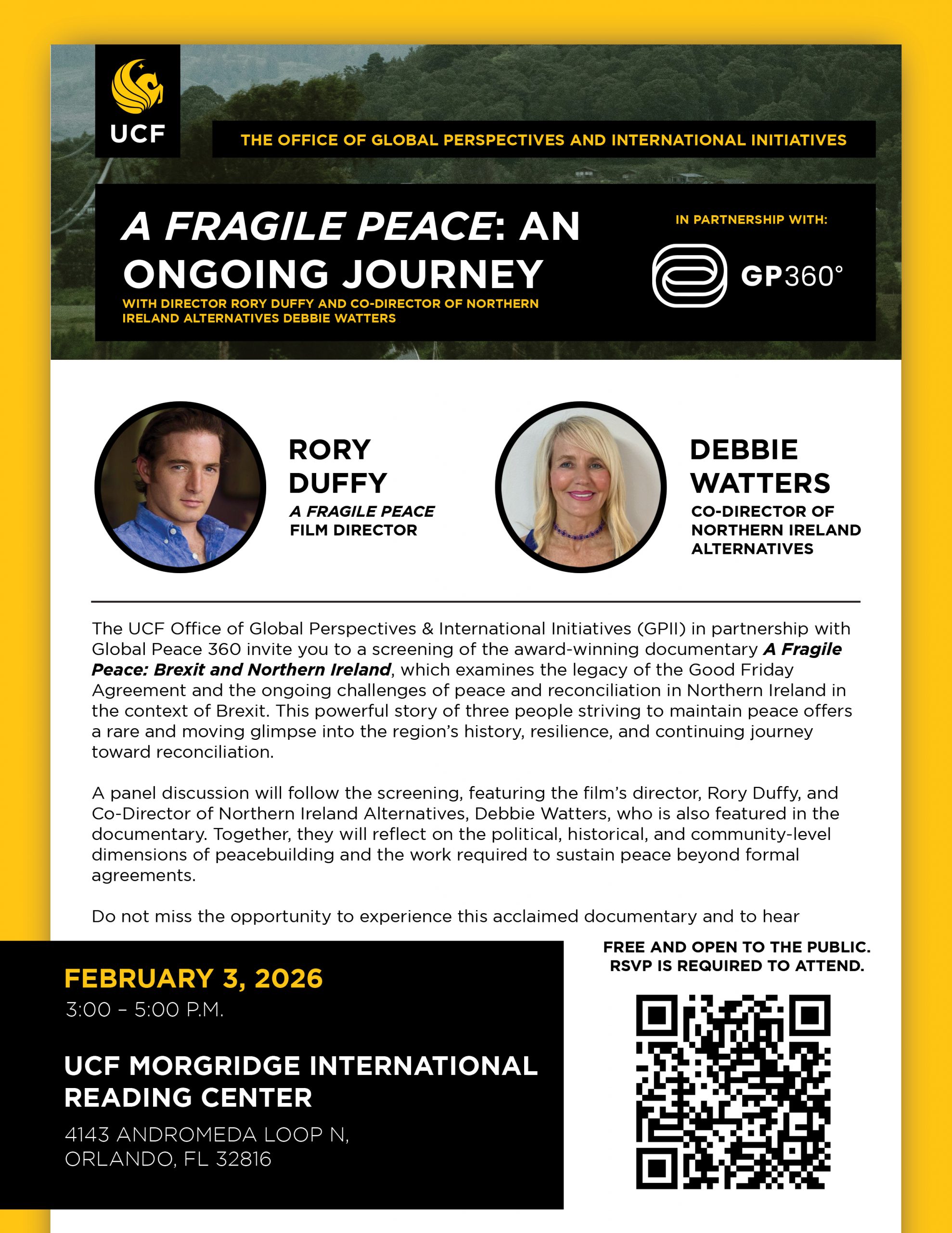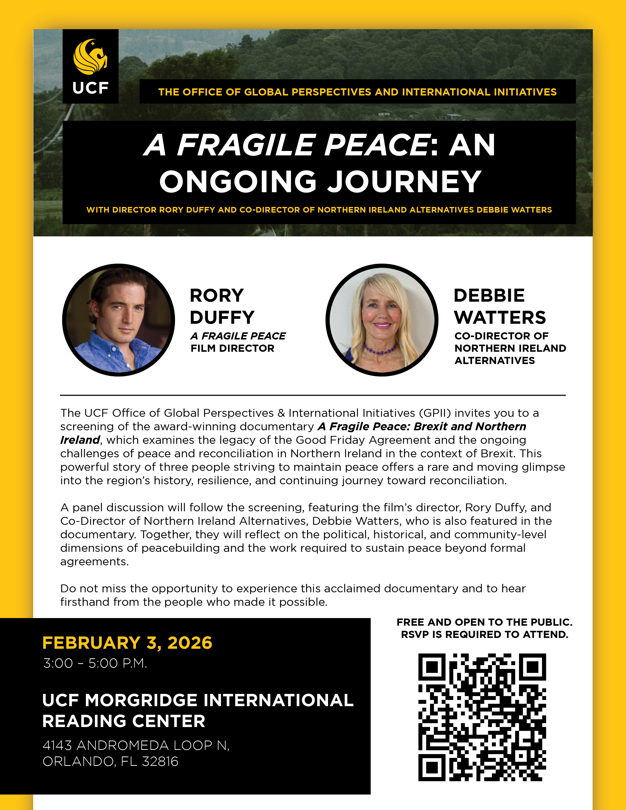The UCF Office of Global Perspectives & International Initiatives (GPII) in partnership with Global Peace 360 invite you to a screening of the award-winning documentary A Fragile Peace: Brexit and Northern Ireland, which examines the legacy of the Good Friday Agreement and the ongoing challenges of peace and reconciliation in Northern Ireland in the context of Brexit. This powerful story of three people striving to maintain peace offers a rare and moving glimpse into the region’s history, resilience, and continuing journey toward reconciliation.